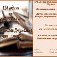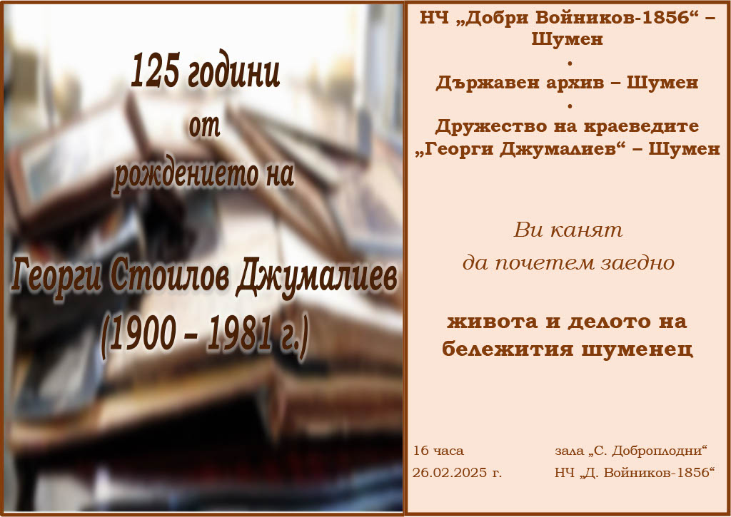 НЧ „Добри Войников – 1856“, Държавният архив в Шумен и Дружеството на краеведите към читалището ще отбележат 125 години от рождението на Георги Джумалиев. По повод годишнината, на 26 февруари, сряда, от 16.00 часа в зала „Сава Доброплодни“ ще бъде представена дигитална документална изложба, посветена на един от най-изтъкнатите краеведи на Шуменския край. По-рано, от 14.00 часа, ще бъдат поднесени цветя пред паметната плоча на мястото, където е била родната му къща.