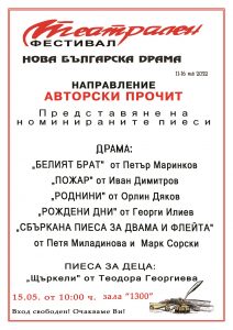 8 пиеси в направление „Авторски прочит“ ще бъдат представени на фестивала „Нова българска драма“