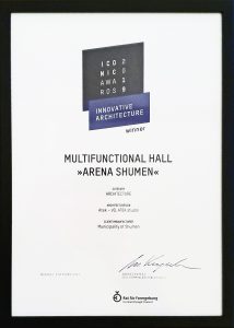 Многофункционалната зала „Арена Шумен“ беше отличена от немската организация ICONIC AWARDS в категория за иновативна архитектура. Наградата беше връчена на церемония в Мюнхен на арх. Калоян Колев от студио „Атек-ВД“, който е един от създателите на архитектурния проект за съоръжението.