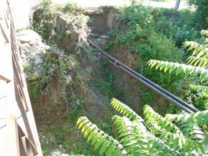 След обилните дъждове през последните месеци свличането на земни маси в тази част на реката сериозно подкопава брега и вече заплашва да компрометира уличното платно.
