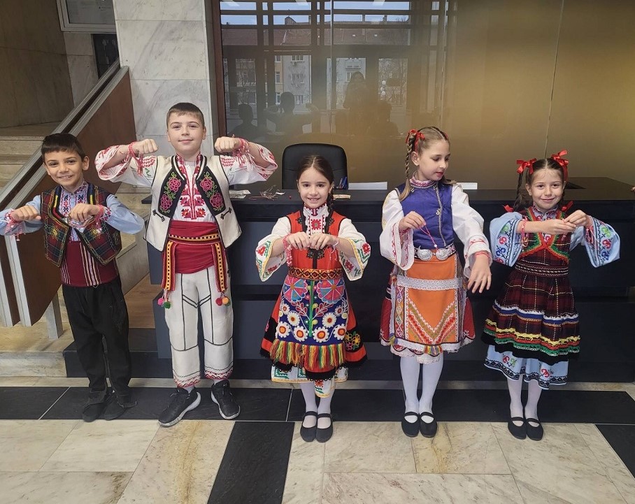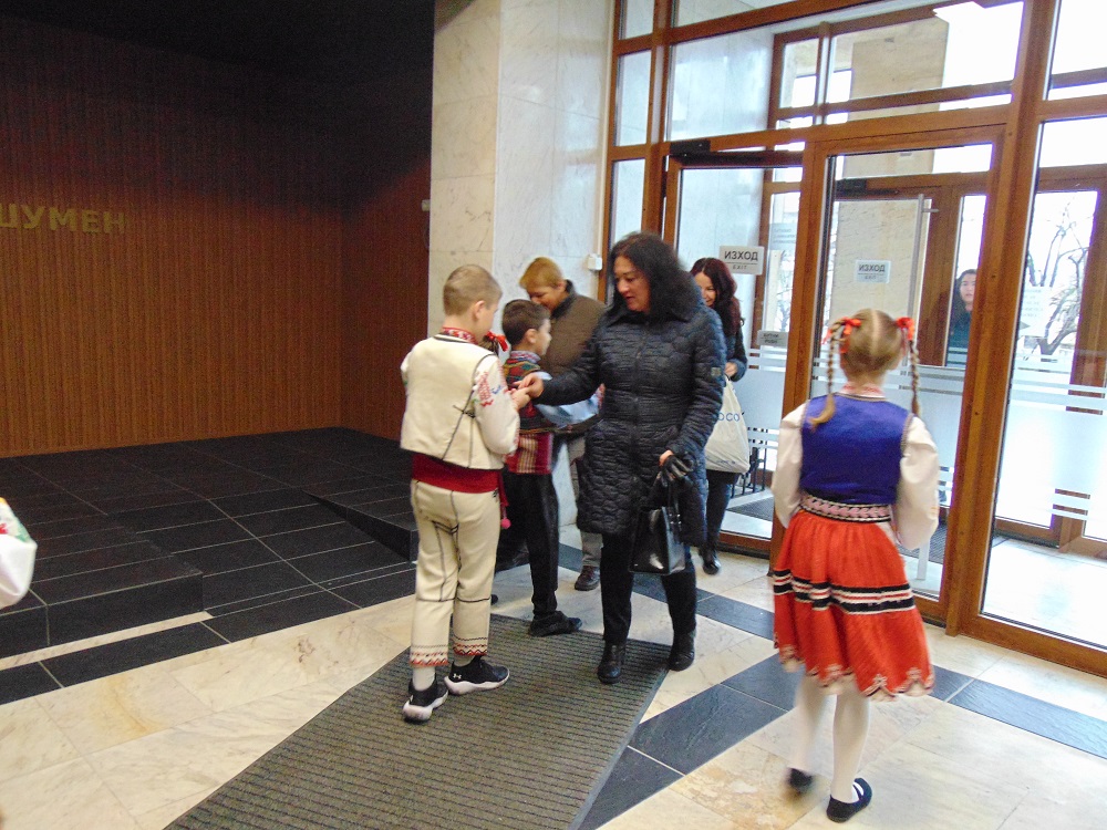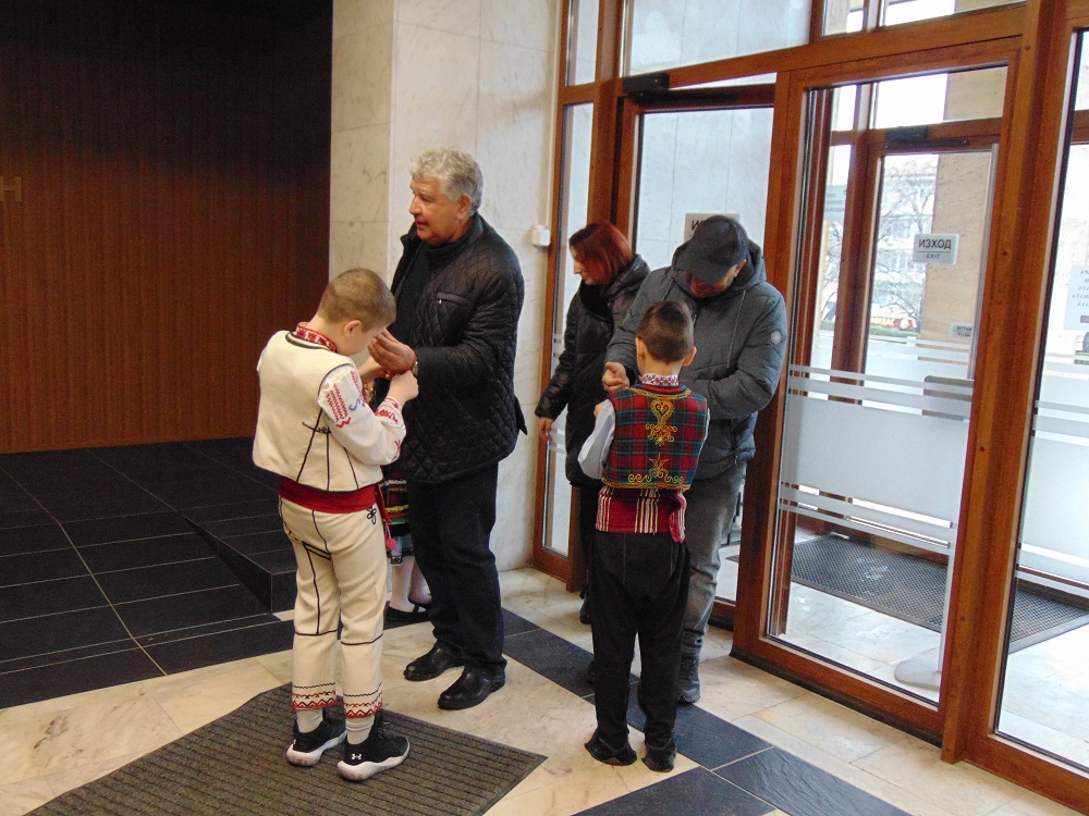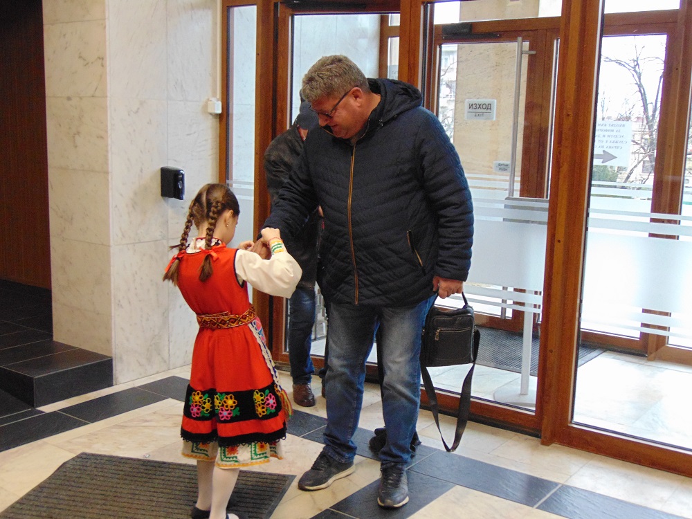 Деца от танцовия ансамбъл „Веселяче“ към Центъра за подкрепа за личностно развитие – ОДК „Анастас Стоянов“ посрещаха служителите в администрацията и гражданите с мартенички, които сами са изработили.