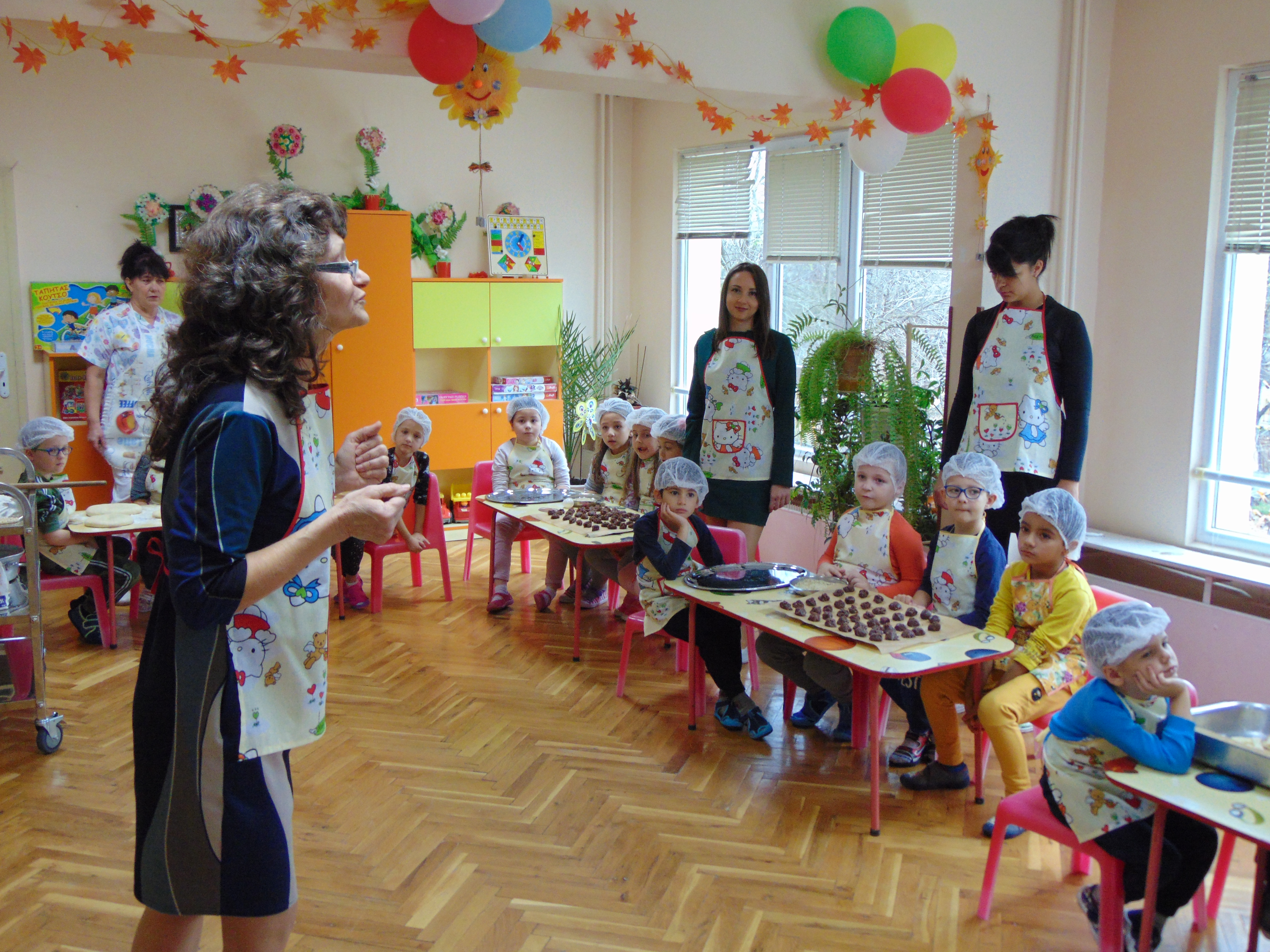 В цялата детска градина ухае на топъл хляб. Заедно с учителите Татяна Йорданова, Виолета Трайкова, Мариела Стаменова, Бояна Христова и Боряна Дочева децата от групите „Звънче“ и „Детелина“, облечени в специално ушити за целта облекла, замесиха и украсиха тестото. Майсторите в кухнята изпекоха красивите погачи, соленки и сладки, с които деца, учители и служители ще почерпят родителите за празника.