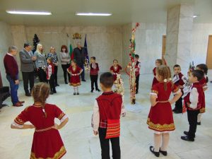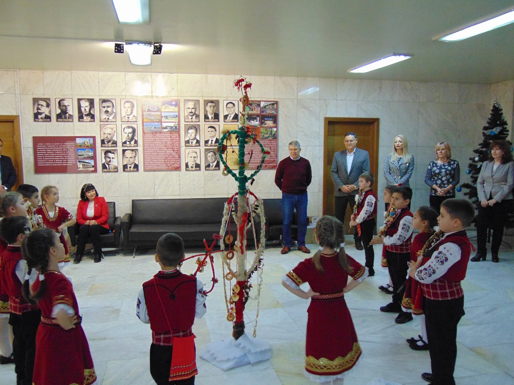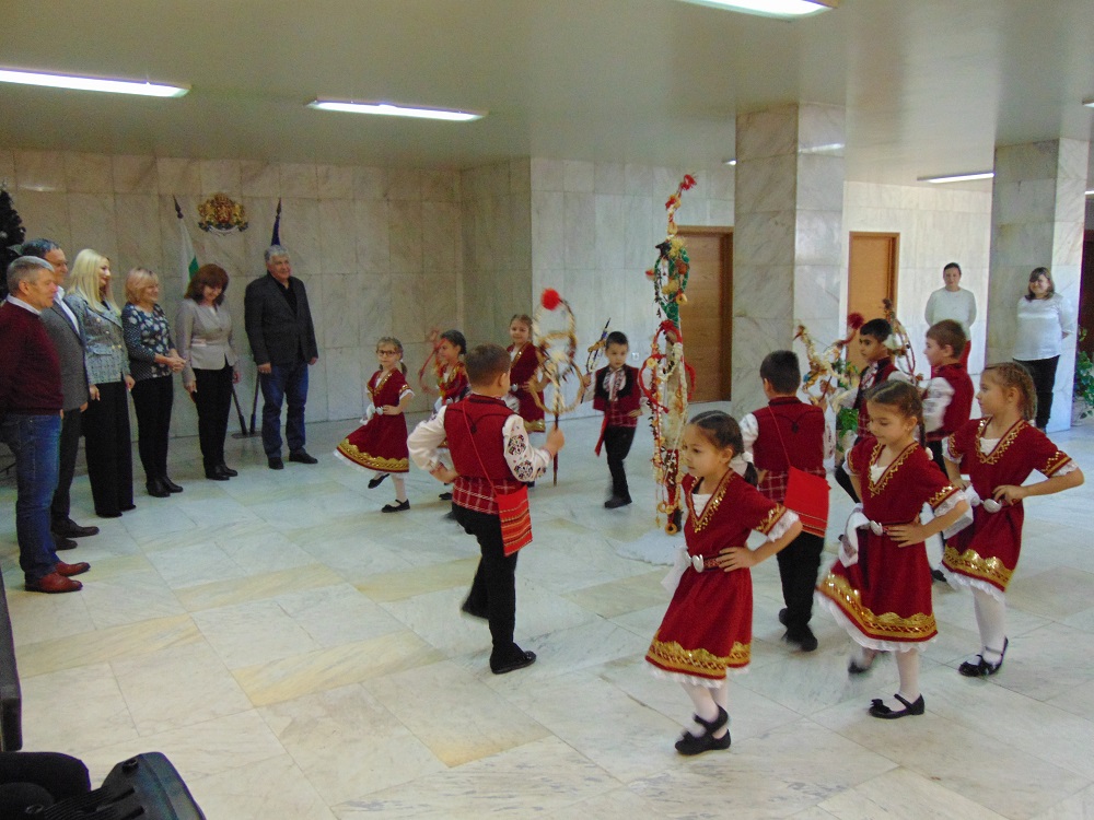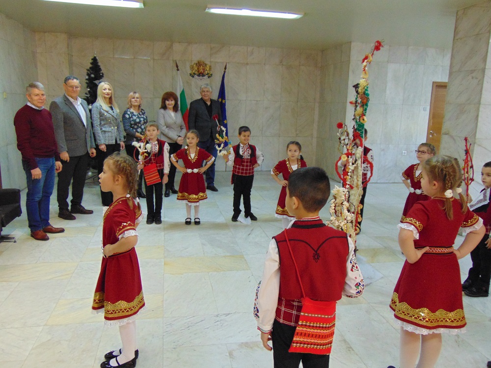 С ръчно изработени сурвакници, украсени според народната традиция с пуканки, сушени плодове и вълна, малките сурвакари наричаха празнични благословии за здраве и берекет, за успешна и благодатна година. Малчуганите пожелаха на кмета Любомир Христов, на неговите заместници и на председателя на Общинския съвет Ася Аспарухова много здраве, успехи и благоденствие.