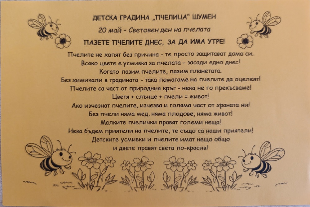 Децата донесоха и специални брошури, които информират за грижата за пчелите и тяхното опазване. Според децата кметът трябва да знае девиза на ДГ „Пчелица“ и на всеки пчелар: „В кошера има мед, защото има ред!“.