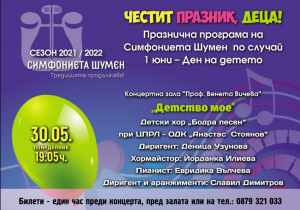 Концерт под надслов „Детство мое“ с участието на детски хор „Бодра песен“ при ЦПЛР-ОДК „Анастас Стоянов“ и Симфониета Шумен ще се състои на 30 май, понеделник, от 19.05 часа в зала „Проф. Венета Вичева“. Музикалното събитие е част от празничната програма на Симфониета Шумен, посветена на 1 юни – Международния ден на детето.
