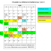 На 19 юни, четвъртък, в 17:00 ч. излизат резултатите от първото класиране за прием на първокласници. Записванията на приетите са от 9:00 ч. на 23 юни до 17:00 ч. на 25 юни.