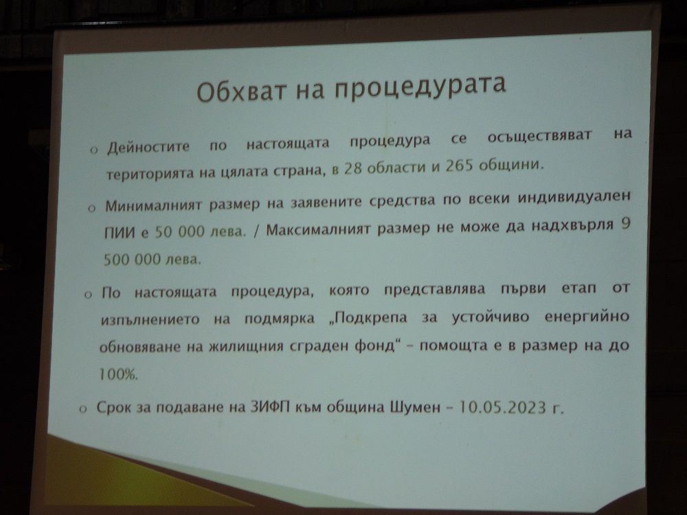 От 2021 година досега с идеята да се кандидатства по тази програма в Шумен са създадени 28 сдружения. За тези, на които предстои да правят сдружения на собствениците, юрисконсултът Десислава Анастасова обърна внимание, че при провеждане на Общите събрания трябва много точно да се изпълнят изискванията на Закона за етажната собственост. Важно условие е при изготвянето на протокола да се изпишат трите имена на всяко лице, което участва в събранието, да се запише как е гласувало лицето и да има негов подпис. Това са задължителни реквизити, без които не може да се направи регистрация на етажната собственост.