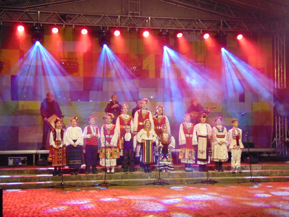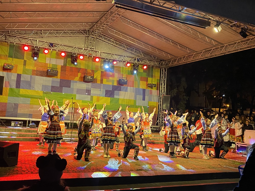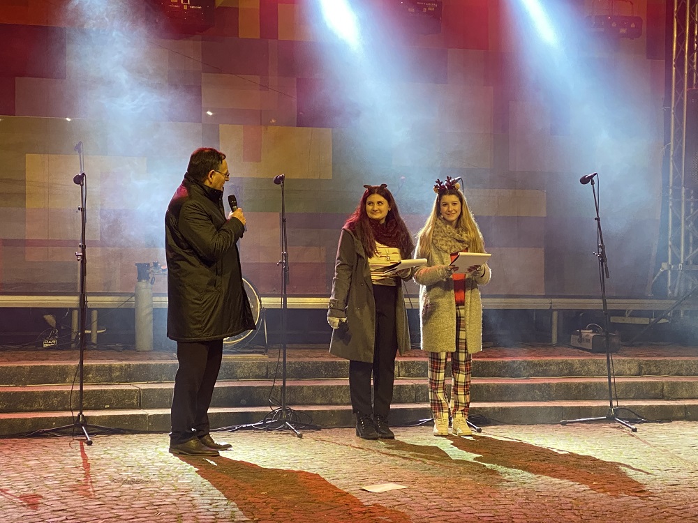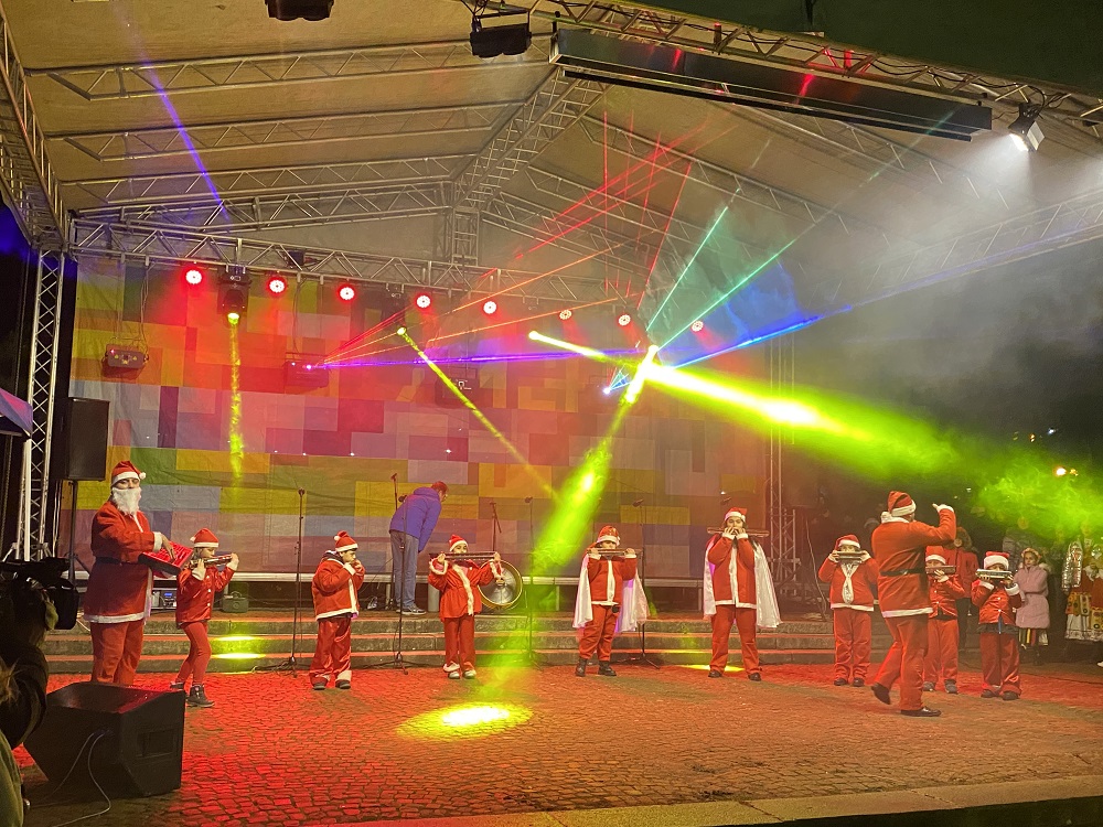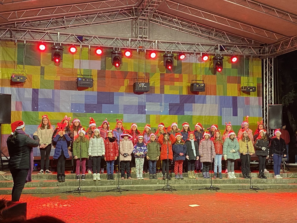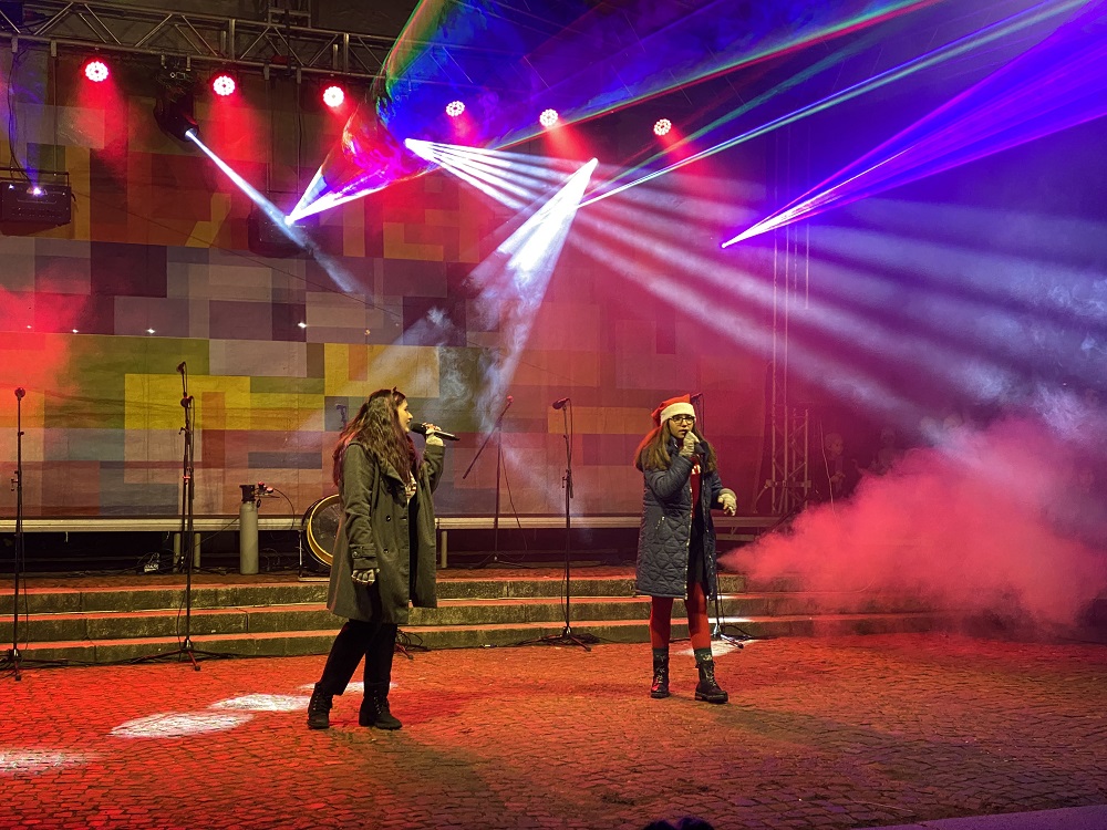 Стотици деца и родители се събраха в градинката до сградата на общинската администрация, за да участват в празничното запалване на коледните светлини в града.