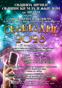 XIII-то издание на Националния конкурс за млади изпълнители на популярна песен „Съзвездие“ ще се проведе на 11 и 12 ноември в концертната зала на Общинския младежки дом в Шумен. В конкурса могат да участват индивидуални изпълнители от цялата страна. Те ще бъдат разпределени в четири възрастови групи: I група – до 7 години; II група – от 8 до 11 години; III група – от 12 до 15 години; IV група – от 16 до 25 години. Участниците се представят с две песни в два тура: I тур – песен на български език и II тур – песен по избор.