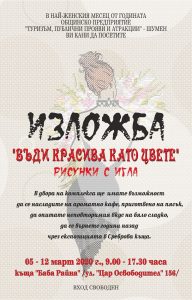 Изложба на бродерии под надслов „Бъди красива като цвете“ ще бъде подредена в къща „Баба Райна“ на ул. „Цар Освободител” № 156 във Възрожденския комплекс в Шумен. Експозицията е посветена на жената и цветята и може да бъде разгледана в дните от 5 до 12 март от 9.00 до 17.30 часа /с изключение на 8 март, неделя/. Творбите са дело на любители на бродериите.