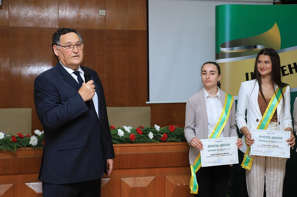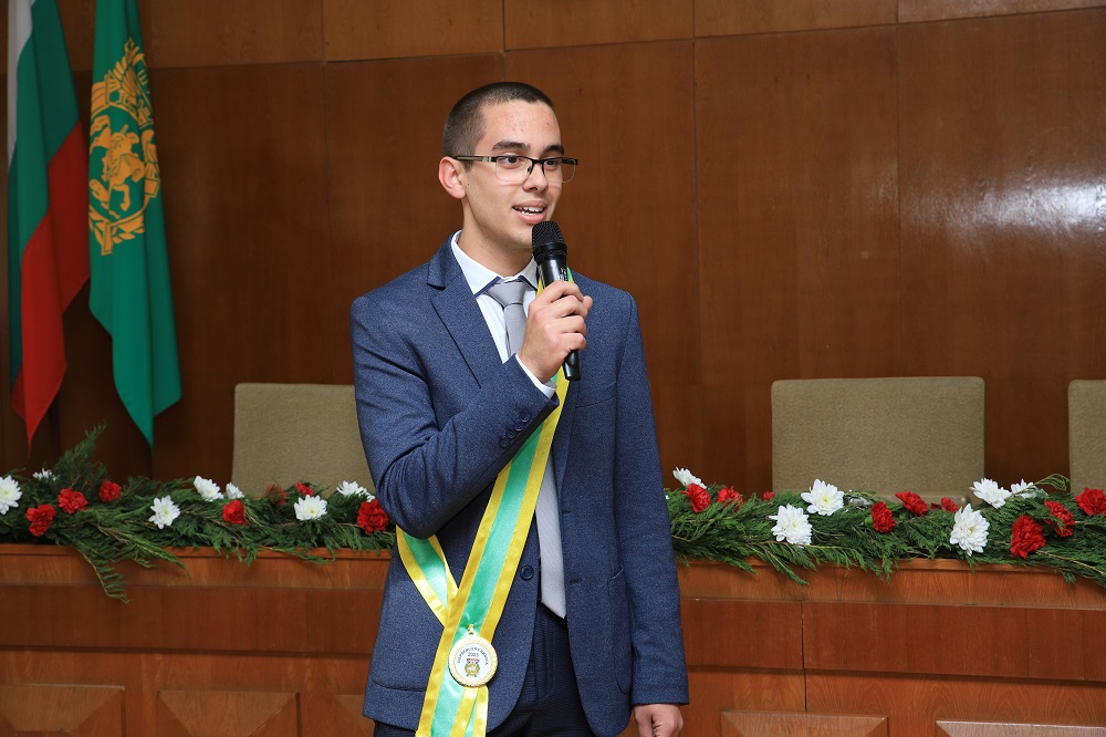 „Човек се учи цял живот, затова продължавайте да се усъвършенствате. Предстои ви дълъг път, по който ще срещате и препятствия. Преодолявайте ги и вървете напред с гордо вдигната глава като граждани, професионалисти и най-важното като добри хора. Уважаеми учители, поздравленията днес са и за вас, защото успехите на вашите ученици са и ваши успехи. Уважаеми родители, бъдете горди с децата си. Споделям вашата радост и съм щастлив да връча това най-високо отличие – първенец на випуска“, каза Христов.
