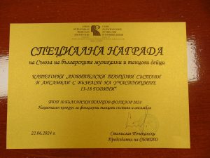 Ансамбъл за народни песни и танци “Шумен” беше удостоен със специалната награда в категория “Любителски танцови състави и ансамбли с възраст на участниците 13-18 години” и се нареди в „Топ 10 Български танцов фолклор 2024“. Наградата се връчва за успешното представяне на състава на Националния конкурс за фолклорни танцови състави и ансамбли от Съюза на  българските музикални и танцови дейци. Събитието се проведе в зала 1 на Националния дворец на културата на 22 юни. Отличието се връчва за танца от тракийската фолклорна област “Наигра ли се, любе ле” по музика на Георги Андреев и хореография на проф. Катя Кайрякова.