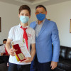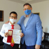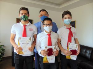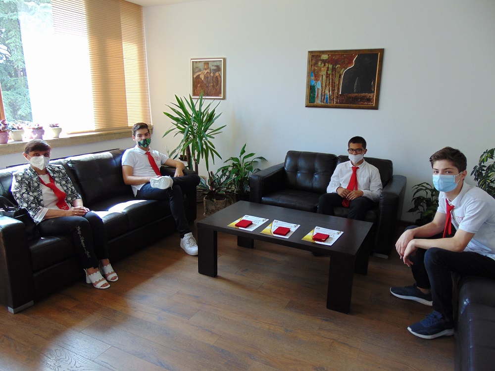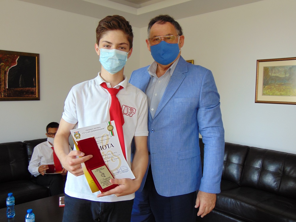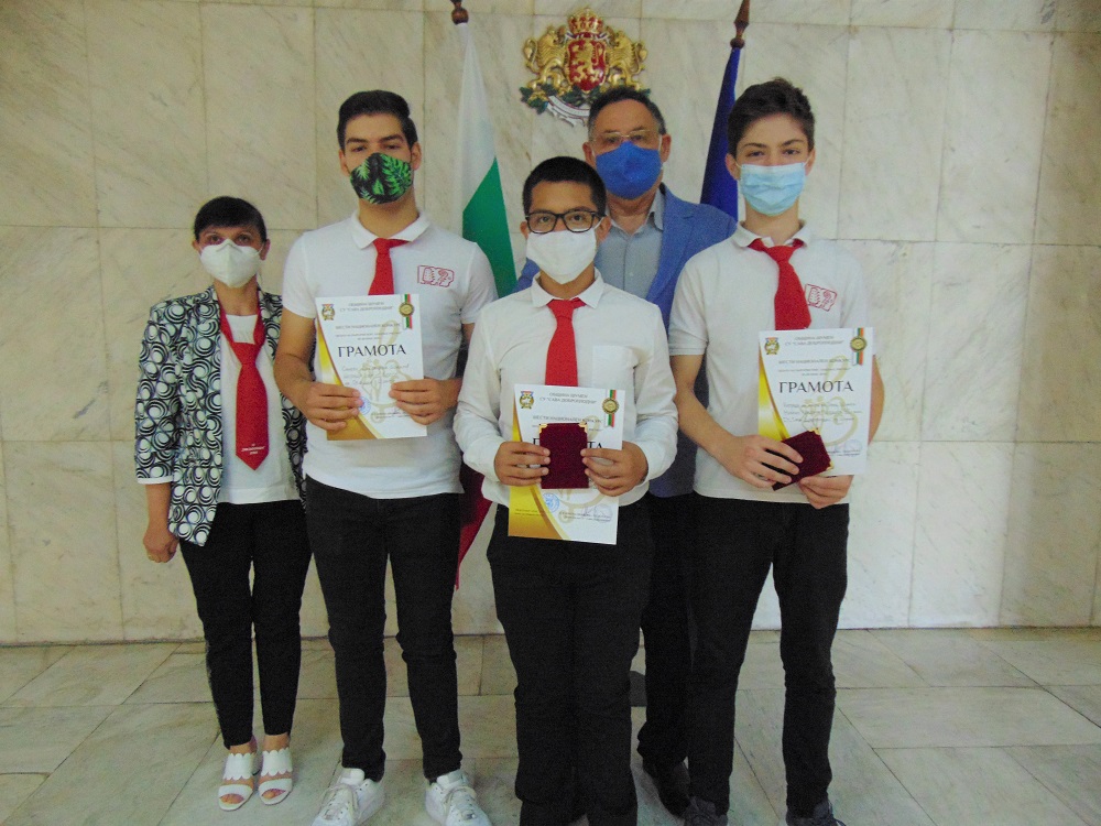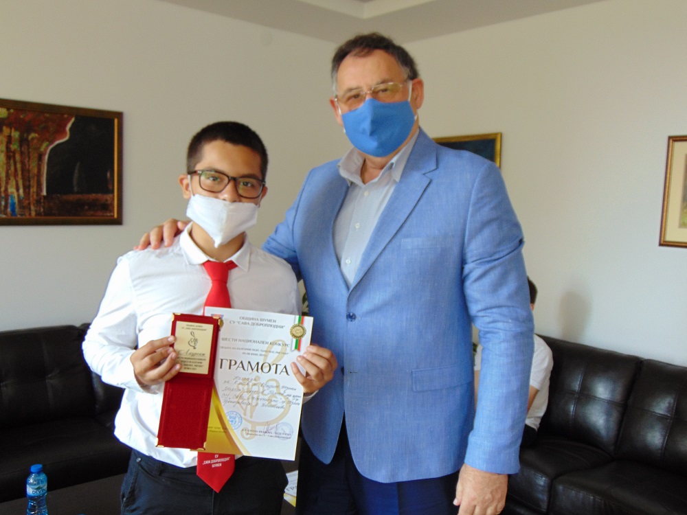 Любомир Христов връчи отличията на учениците от СУ „Сава Доброплодни“, които спечелиха специалната награда на кмета на Община Шумен в шестия национален конкурс „Децата на България пеят, танцуват, рисуват“. На срещата присъства и Ивелина Иванова, зам.-директор по учебната дейност в СУ „Сава Доброплодни“.