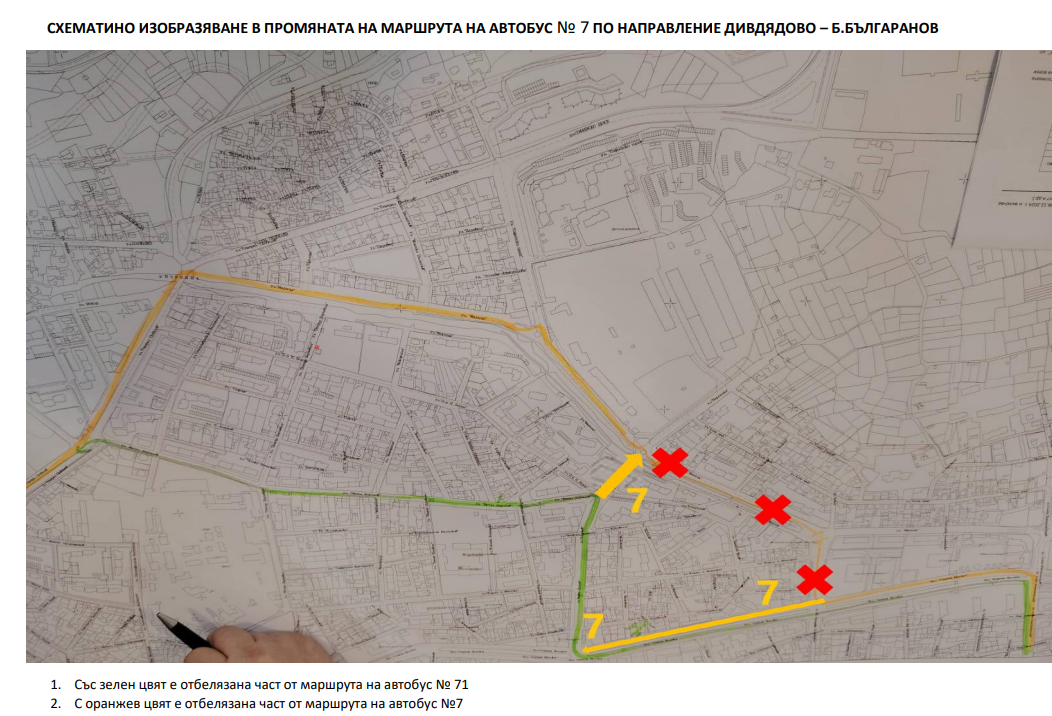 Заместник-кметът по икономическо развитие Николай Колев обясни, че в посока от кв. „Дивдядово“ към кв. „Боян Българанов“, в участъка на ул. „Климент Охридски“ и ул. „Марица“, няма автобусна спирка и този участък отпада от новия маршрут. Тоест, автобусите по линия № 7 да не завиват надясно след зала „Младост“, а да продължават направо към поликлиниката, по маршрута на линия № 71. Спирката за поликлиниката е на регулираното със светофари кръстовище, срещу бензиностанцията, и за пътниците преминаването на отсрещния тротоар при ДКЦ 1 ще бъде безопасно, аргументираха се още експертите.