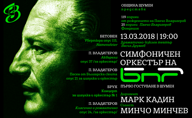 Симфоничният оркестър на Българското национално радио (БНР) ще изнесе концерт за първи път в Шумен. Събитието ще се състои на 13 март от 19:00 часа в Драматично-кукления театър„Васил Друмев“ под диригентството на Марк Кадин със солист проф. Минчо Минчев.Гостуването на оркестъра е по случай 119-годишнината от рождението на Панчо Владигеров и 25 години от основаване на Фондация „Панчо Владигеров“.