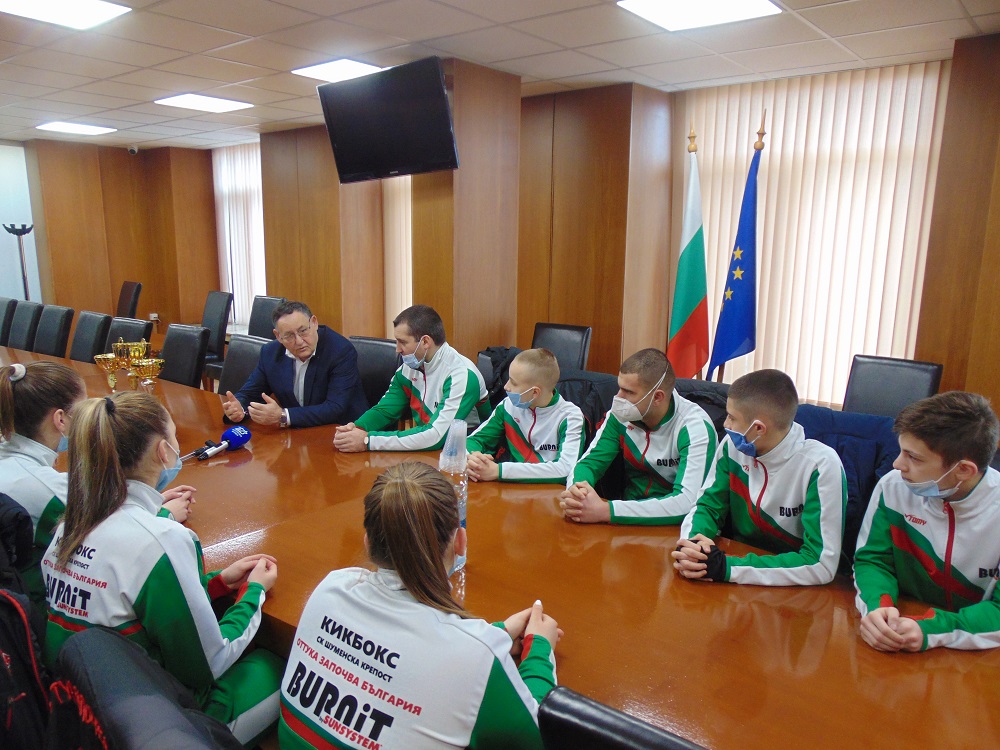 Кметът на Шумен Любомир Христов се срещна днес със състезатели от спортния клуб „Шуменска крепост“, които направиха много силно представяне на държавното първенство по кик бокс в стил „лоу кик“. В състезанието, което се проведе в зала „Арена Шумен“, те спечелиха общо 24 медала и грабнаха титлата в отборното класиране на шампионата. По време на срещата кикбоксьорите показаха и част от завоюваните трофеи.