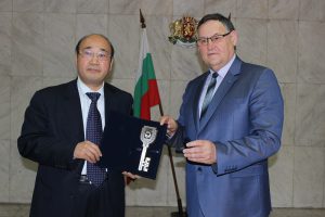 Любомир Христов връчи на г-н Ху Цюен символичен ключ за града. „Вратата на Шумен е отворена за Вас. Този ключ е знак за нашето приятелство и за желанието ни да продължим и да развием двустранните ни отношения,“ каза кметът. Гостите подариха на кмета и на председателя на Общинския съвет Борислав Беджев специално изработени постери, калиграфски изписани с пожелания за мир, развитие и просперитет на двете страни, картини на оризова хартия с характерните за древното китайско изобразително изкуство символи на изобилието и благоденствието.