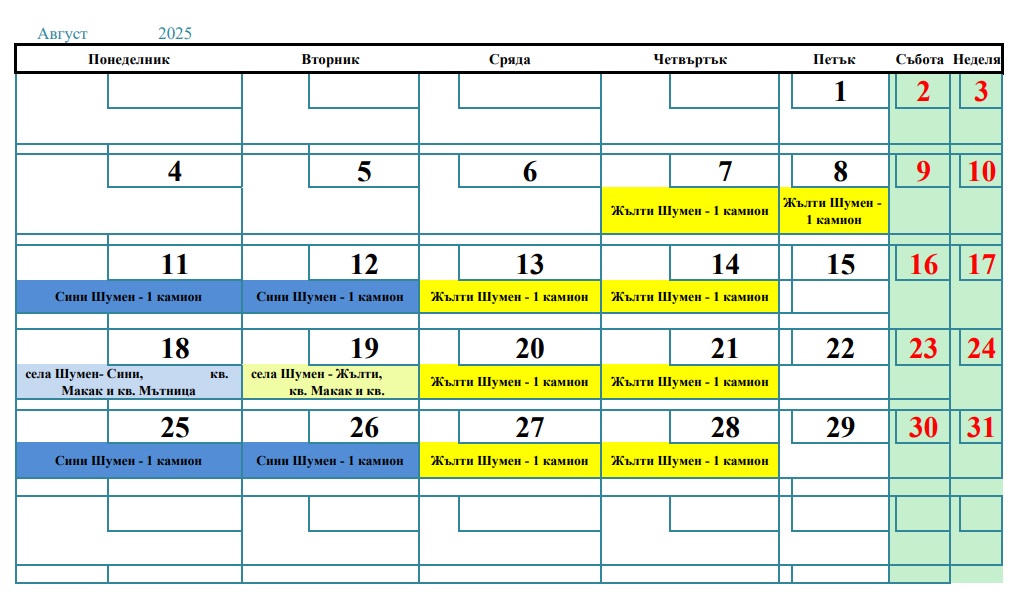 Камионът за пластмасови и метални отпадъци ще извозва от град Шумен на 7, 8, 13, 14, 20, 21, 27 и 28 август. В селата и кварталите „Мътница“ и „Макак“ графикът ще се изпълнява на 19 август (вторник).