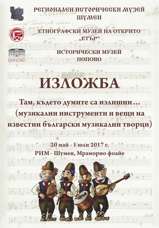 В централната експозиция ще бъде открита изложбата „Там където думите са излишни” – музикални инструменти и вещи на известни български музикални дейци, сред които са нашият съгражданин Тодор Колев и Люба Велич. Изложбата е резултат на съвместната работа на три културни организации – Етнографски музей на открито „Етър‘, Исторически музей – Попово и Регионален исторически музей – Шумен. Тя проследява зараждането на музикалното дело, както и неговото развитие след Освобождението в тези три града. Представени са и различни музикални инструменти – духови, струнни, български народни инструменти, детски свирки, както и личната колекция устни хармоники на дуо Лечеви, също от Шумен.