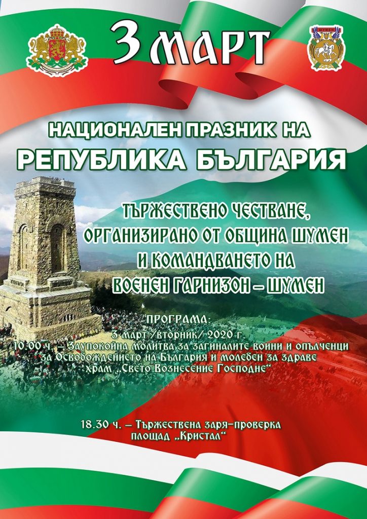 „ДНИ НА ДЕТЕТО“ – работилница за деца Организатор: НЧ „Тодор Петков – 1963“ – 054/830 572 9:00: 181 ГОДИНИ ОТ РОЖДЕНИЕТО НА ВАСИЛ ЛЕВСКИ9:00: 181 ГОДИНИ ОТ РОЖДЕНИЕТО НА ВАСИЛ ЛЕВСКИ18.07.2018 140 ГОДИНИ ОТ ОСВОБОЖДЕНИЕТО НА ШУМЕН 181 ГОДИНИ ОТ РОЖДЕНИЕТО НА ВАСИЛ ЛЕВСКИ 9.00 ч. – Храм „Свето Вознесение Господне“ ПАНИХИДА ЗА ЗАГИНАЛИТЕ. МОЛЕБЕН ЗА ЗДРАВЕ И БЛАГОДЕНСТВИЕ 10.00 ч. – Паметник на погребаните руски воини, кв. „Млада гвардия“ ПАНИХИДА ЗА ЗАГИНАЛИТЕ ВЪВ ВОЙНИТЕ РУСКИ ВОИНИ 11.30 ч. – Пред паметника на Васил Левски РИТУАЛ ПО ПОЛАГАНЕ НА ВЕНЦИ И ЦВЕТЯ 18.30 ч. – пл. „Освобождение“ КОНЦЕРТ-СПЕКТАКЪЛ С УЧАСТИЕТО НА НД „ТРАДИЦИЯ“ И РОК ГРУПА „ЕПИЗОД“ Организатор: Община Шумен – 054/ 857 751, Културни институти |