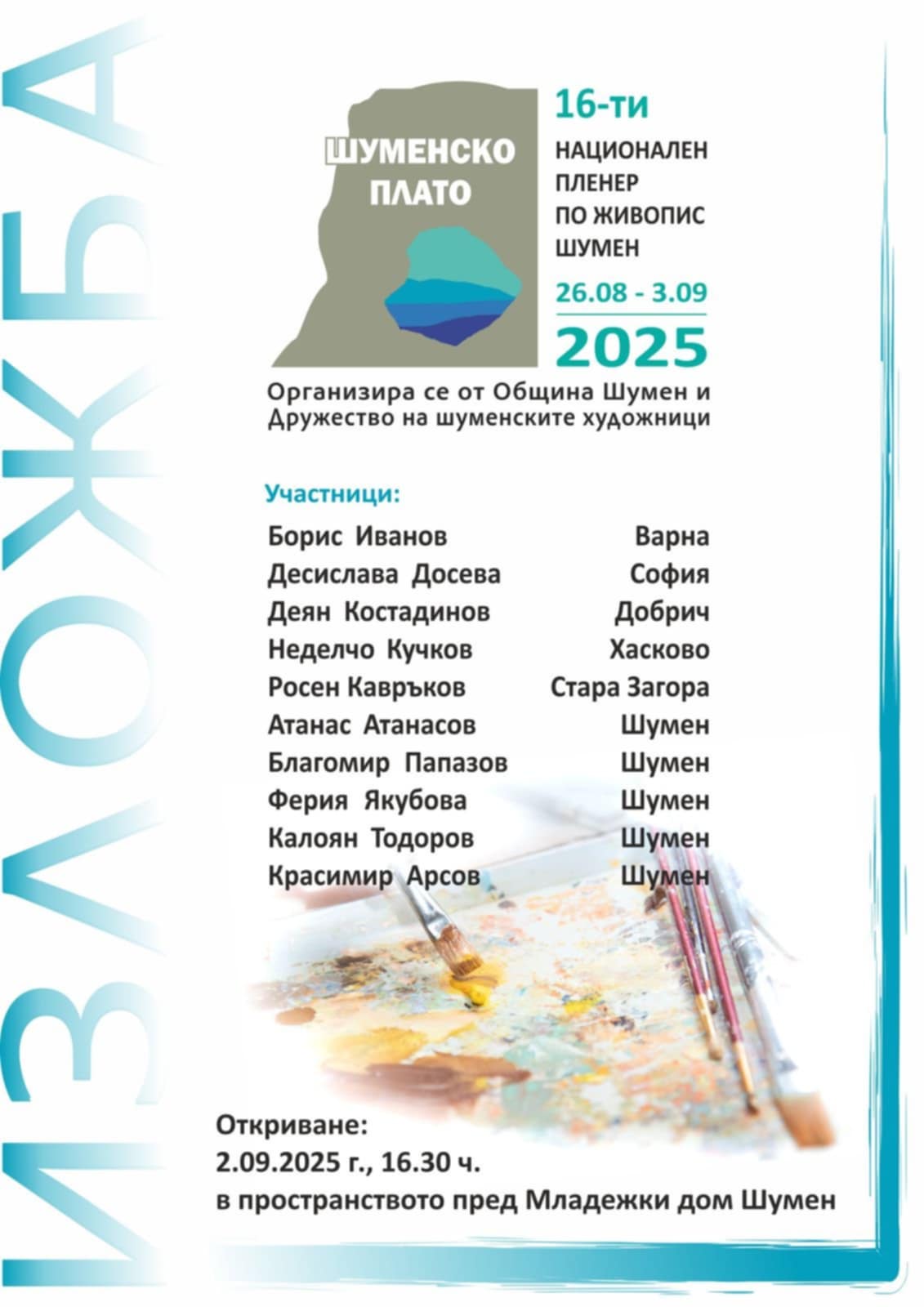 Изложбата ще включва творбите на десетимата художници – Борис Иванов, Десислава Досева, Деян Костадинов, Неделчо Кучков, Росен Кавръков, Атанас Атанасов, Благомир Папазов, Ферия Якубова, Калоян Тодоров и Красимир Арсов. Това е шестнадесетото издание на пленера по живопис „Шуменско плато“. Участие в него взеха представители от Шумен, Варна, Добрич, Стара Загора, Хасково, София.