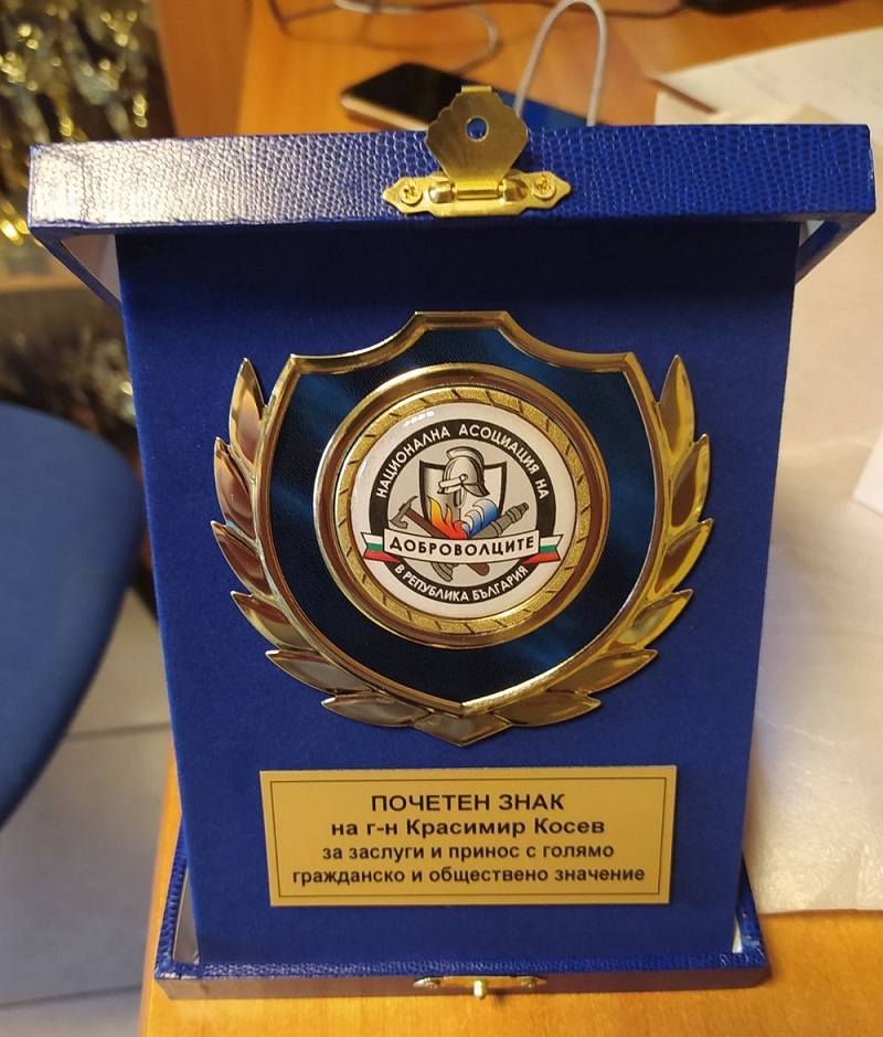 Призът е за цялостната му дейност и активно участие в спасителни и аварийно-възстановителни работи при бедствия, пожари и други извънредни ситуации. Той е сред учредителите на асоциацията на доброволците в страната. За да връчи лично наградата на Красимир Косев днес пристигна специално екип от София. Поради извънредната обстановка и мерките за безопасност обаче церемонията по награждаването се състоя в неформална обстановка в дома му.