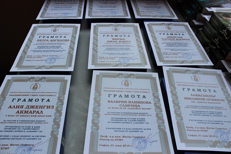 На специална церемония днес в танцувалната зала на Младежкия дом бяха връчени наградите на отличените ученици в конкурса „Индустрията в моя регион“. Той се организира от Химикотехнологичния и металургичен университет и Българската асоциация на металургичната индустрия. Инициативата се осъществява под патронажа на кмета на община Шумен Любомир Христов и се провежда с финансовата подкрепа на „Алкомет“ АД. Тази година в конкурса участваха 110 ученици от 1 до 12 клас от Шумен и областта.