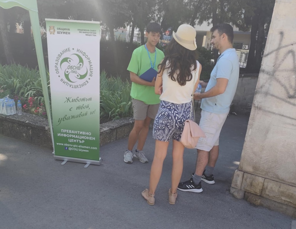 „Превенцията има лице и този път предпочетохме младите хора да анкетират и информират минувачите за рисковете от употребата на психоактивни вещества, които се явяват значим здравен и социален проблем“– сподели Иглика Пенчева – психолог към Превантивно-информационен център в Шумен.