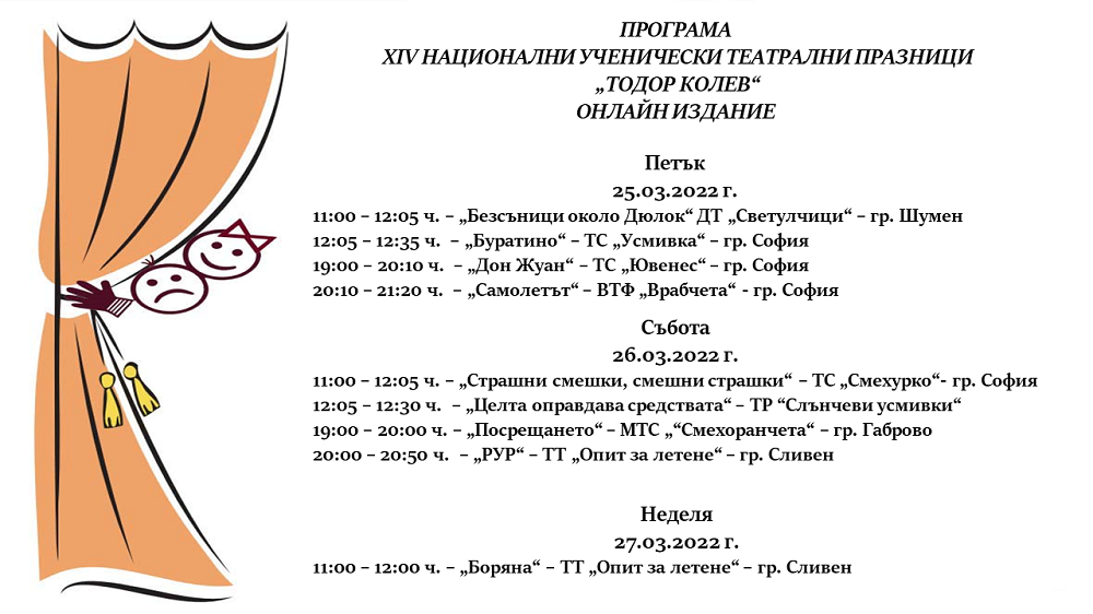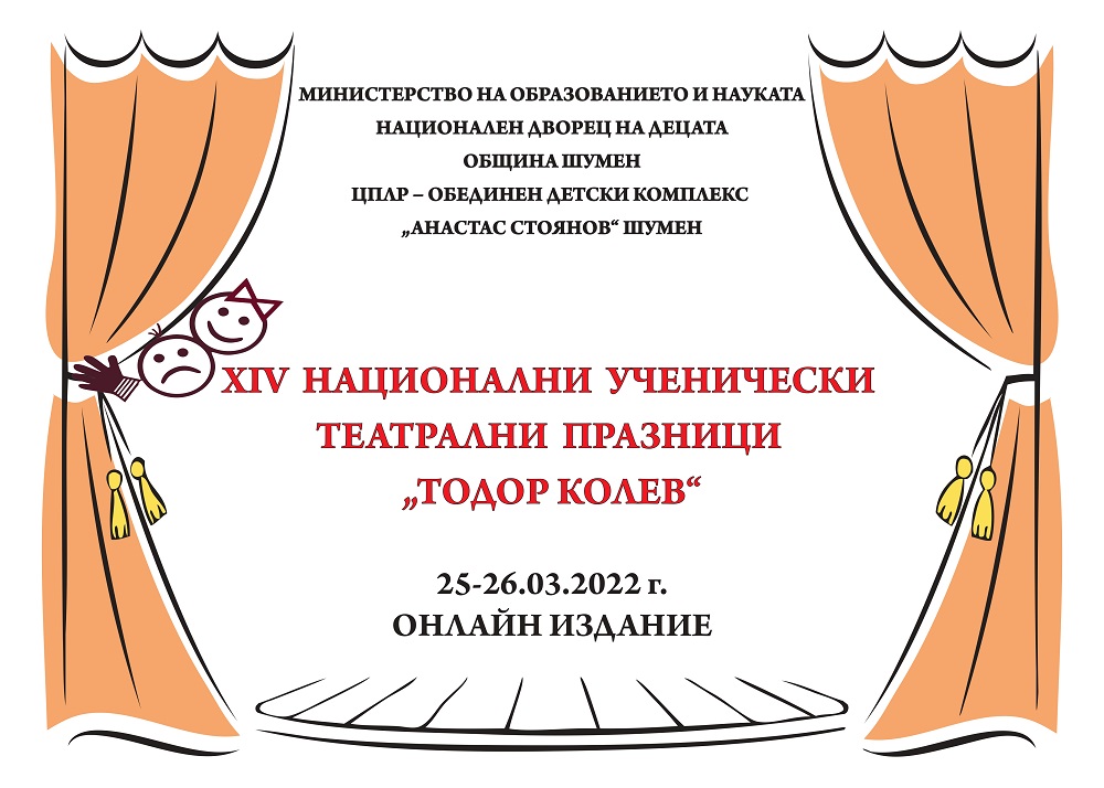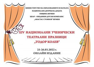 Четиринадесетите Национални ученически театрални празници ще се състоят в дните от 25 до 27 март. Те ще се проведат онлайн и ще могат да се гледат в YouTube канала на ЦПЛР-ОДК „Анастас Стоянов“. В тазгодишното издание на събитието ще участват осем театрални състава от Шумен, Сливен, Габрово и София.