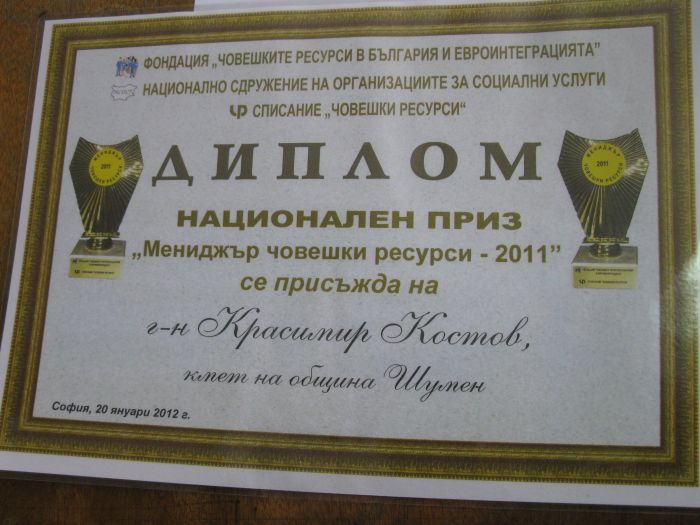 Кметът на община Шумен Красимир Костов ще получи Националния приз "Мениджър човешки ресурси – 2011". Тържествената церемония ще се състои в столицата на 20 януари 2012 г. /петък/ от 19.00 часа в "Гранд хотел София".