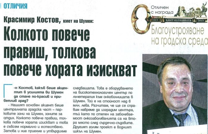 „Изминава една трудна година, с доста проблеми и предизвикателства. Година, в която успяхме да гарантираме нормалното функциониране на всички общински структури, изпълнихме поетите ангажименти и годишните програма, които стояха пред нас по всички основни сфери и дейности", каза в експозете си кметът Красимир Костов. Той коментира, че общината е запазила финансовата стабилност, и е направила много за подкрепа на шуменския бизнес с разплащането на всички дължими суми. „Оперативните данни сочат, че имаме по-добро изпълнение на бюджета спрямо 2012 г. Очакваме нормално изпълнение на бюджет 2013, очертава се и преходен остатък", допълни Костов.