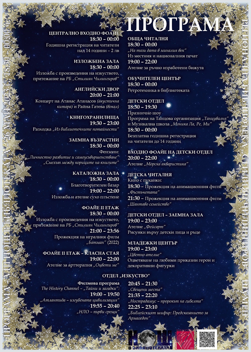 Разнообразни инициативи в различните библиотечни пространства организира Регионалната библиотека „Стилиян Чилингиров“ в Шумен на 26 май от 18.30 до 24.00 часа.