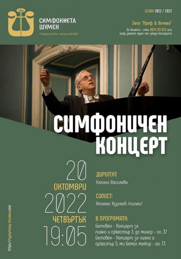 Свой творчески прочит на Концертите за пиано и оркестър № 3, оп. 37 и № 5, оп. 73 от Лудвиг ван Бетовен ще предложи на шуменската публика акад. Атанас Куртев тази вечер от 19.05 в зала “проф. Венета Вичева“. Клавирните концерти на Бетовен бележат нов етап в развитието на жанра. Композиторът написва трети, четвърти и пети концерт в така наречения зрял период от своето творчество. По сложност и задълбоченост на съдържанието те се доближават до жанра на симфонията.