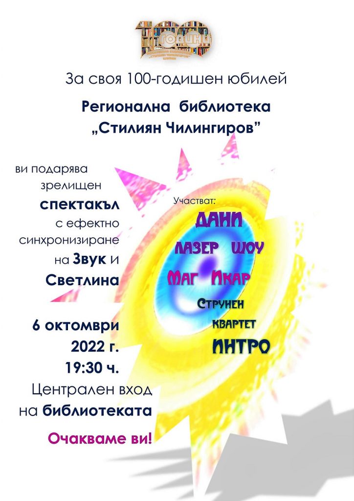 Вековен юбилей чества Регионалната библиотека “Стилиян Чилингиров” в Шумен. Библиотечните дейци посрещнаха днес много гости и приятели от града и страната и получиха поздравления от кмета Любомир Христов, министерството на културата, областния управител, председателя на Общинския съвет, обществени и културни организации от цялата страна.