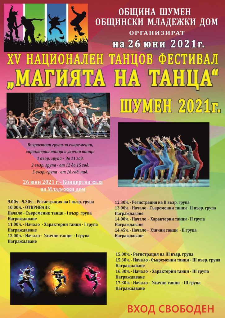 XV издание на Националния танцов фестивал „Магията на танца“ ще се проведе тази събота (на 26 юни) в концертната зала на Младежкия дом. Събитието се организира от Община Шумен и Общинския младежки дом. В програмата са включени съвременни танци, характерни танци и улични танци – брейк и хип-хоп. Участниците ще се състезават в три възрастови групи: