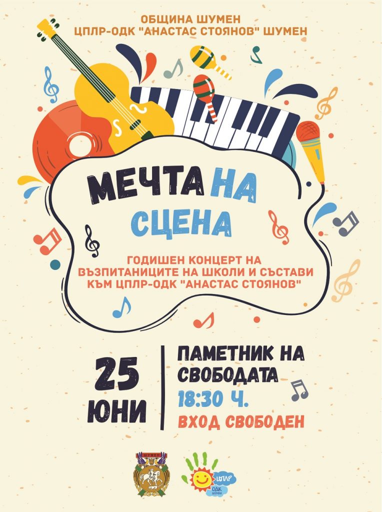 Традиционният годишен концерт на школите и съставите към ЦПЛР-ОДК „Атанас Стоянов“ ще се състои на 25 юни (петък) от 18:30 часа в парка до общината. Тази година събитието е под наслов „Мечта на сцената“. В концерта ще вземат участие хор “Бодра песен“, танцовият ансамбъл „Веселяче“, ученици от школите по поп и джаз пеене, пиано, цигулка, устни хармоники, китара, електронни инструменти, народно пеене и балет. Ще бъде представена и изложба с творби на децата от „Арт“ школата, школите по дърворезба, фотография, както и експедиция „Млад археолог“.