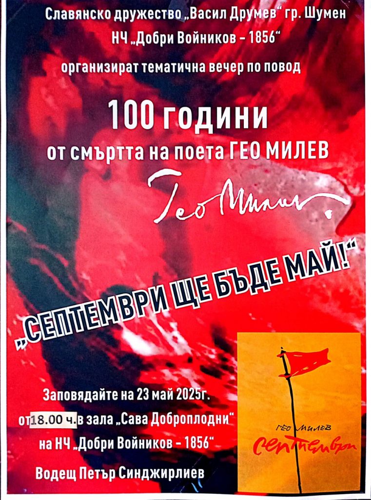Славянското дружество „Васил Друмев“ и НЧ „Добри Войников – 1856“ организират вечер, посветена на 100 години от смъртта и 130 години от рождението на Гео Милев.