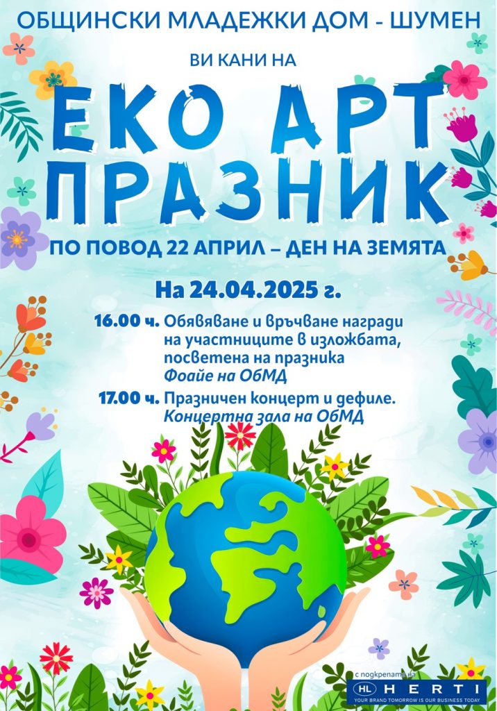 На 24 април 2025 година ще се проведе ЕКО АРТ ПРАЗНИК, организиран от Общински младежки дом – Шумен. Това е продължение на творческа поредица за деца и младежи, която всяка година тематично е обвързана с различни поводи и празници.