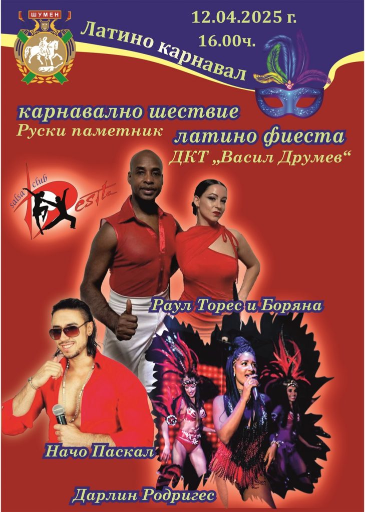 Община Шумен и Салса клуб „Десита“ организират карнавално шествие и латино фиеста на 12 април. Събитието ще започне в 16:00 ч. от Руски паметник, по пешеходната зона на бул. „Славянски“ до Драматично-кукления театър „Васил Друмев“.