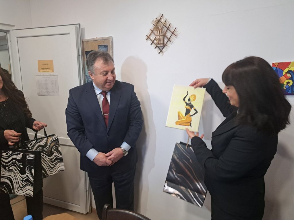 Те съобщиха, че са изработили мартеници за децата от МБАЛ – Шумен и са ги изпратили по кмета да ги подари на Детското отделение за Баба Марта, като показаха и други предмети и украси, които изработват ръчно като част от часовете по различните видове терапии. Именно такъв сувенир те подариха на заместник-министър Ефремова.