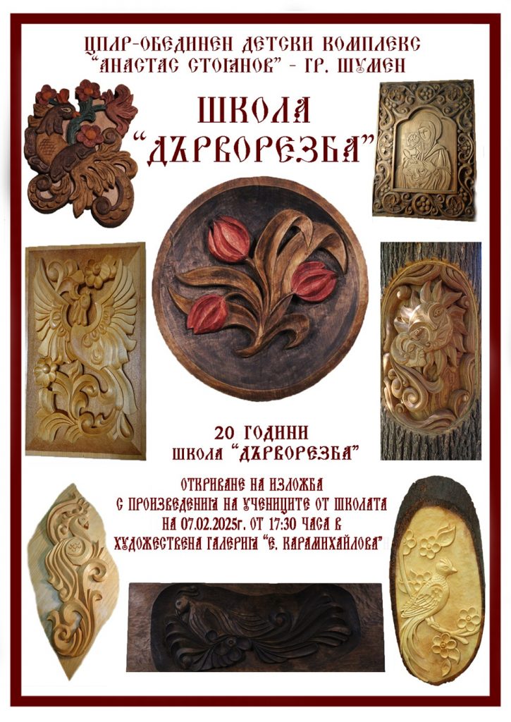 Изложба с произведения на учениците от школа „Дърворезба“ към ЦПЛР-ОДК „Анастас Шумен“ – Шумен, с ръководител г-н Ангел Минчев, ще бъде открита на 7 февруари от 17:30 ч. в ХГ „Елена Карамихайлова“.