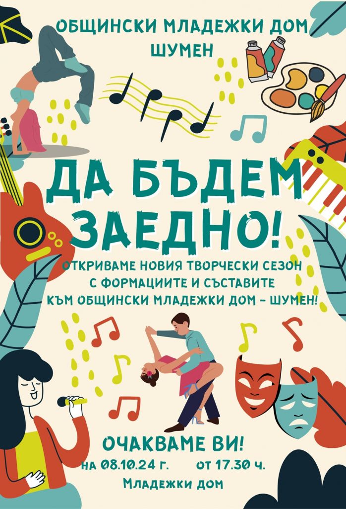 Общинският младежки дом в Шумен открива своята нова творческа година на 8 октомври (вторник) от 17:30 часа с празничен концерт на формациите и съставите към дома. Феерията, динамиката, грацията на танцовото изкуство, вокалното, инструментално и актьорско майсторство ще изпълнят богатата и разнообразна програма.