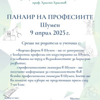 Поканени са всички родители и ученици, на които им предстои кандидатстване след 7-ми клас, да се срещнат с учители и ученици от професионалните гимназии в Шумен. На щандовете ще могат да се информират за обучението в различните специалности, иновативната учебна среда, възможностите за практическа работа и стажове.