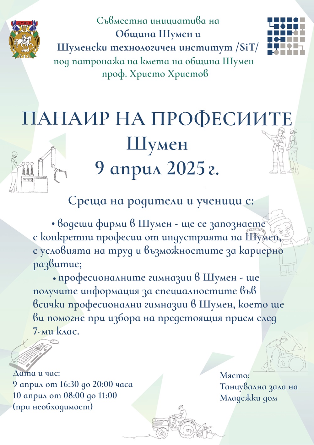 Община Шумен и Шуменският технологичен институт обединяват усилията си в подкрепа на професионалното образование и ранното кариерно ориентиране, като организират „Панаир на професиите“. Събитието ще се проведе на 9-ти април от 16:30 часа в Танцувална зала на Младежкия дом в Шумен.