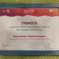 Община Шумен получи грамота „община ентусиаст“ за участието си в 41-то издание на най-голямото туристическо изложение в България с международен характер – „Ваканция & СПА Експо“. Форумът се проведе от 9 до 11 март 2025 г. в София и е един от водещите на сектора у нас.