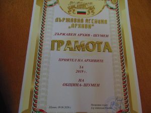 Благодарствена грамота в категорията „Приятел на архивите“ получи Община Шумен по повод Международния ден на архивите – 9 юни. Отличието беше връчено на зам.-кмета по образование и култура Найден Косев от началника на Държавния архив в Шумен Антония Панева. Грамотата се връчва за успешната и ползотворна съвместна дейност на общината и архива по организирането и представянето на изложбата, посветена на 120 години от рождението на Панчо Владигеров през 2019-та година.