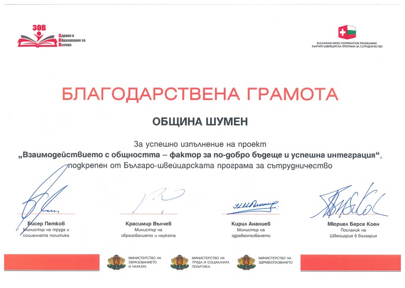 Шумен получи отличие за принос към социалното включване на хора от уязвимите групи и успешното реализиране на проекта “Взаимодействието с общността – фактор за по-добро бъдеще и успешна интеграция” по Програма ЗОВ(Здраве и образование за всички) на Българо-швейцарската програма за сътрудничество.