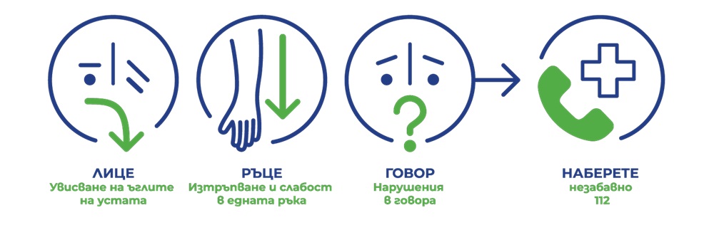 ВНИМАНИЕ! При потвърждение на дори само един от трите симптома – разкривено лице, слабост в ръцете или нарушен говор: