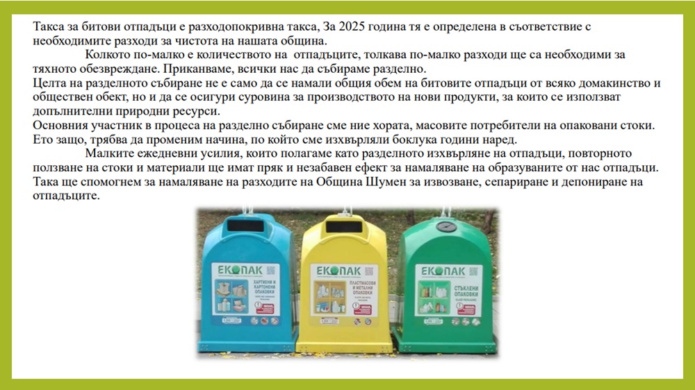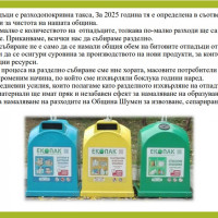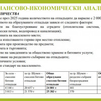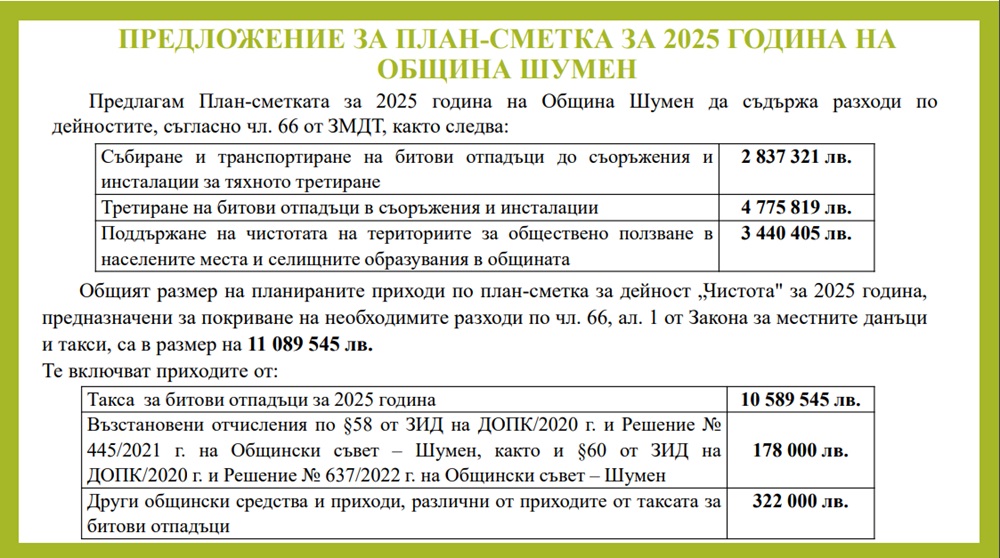 Предложението на общинската администрация за увеличаване на размера на такса битови отпадъци през следващата година е базирано на ясни разчети, така че планираните приходи в размер на 11 089 545 лева да покрият разходите по събиране и транспортиране на битови отпадъци, тяхното третиране в съоръжения и инсталации и дейностите по поддържането на чистотата на териториите за обществено ползване в града, кварталите и селата. Освен това основната цел е и предоставяне на по-качествена услуга. Това стана ясно на брифинг, на който кметът на Шумен проф. Христо Христов, зам.-кметът по „Бюджет и финанси“ Десислава Петрова, зам.-кметът по „Европейски политики, екология и туризъм“ Даниела Русева и експерти от отделите „Екология“ и „Местни данъци и ТБО“ разясниха в детайли предложената за обществено обсъждане план-сметка по чистотата.