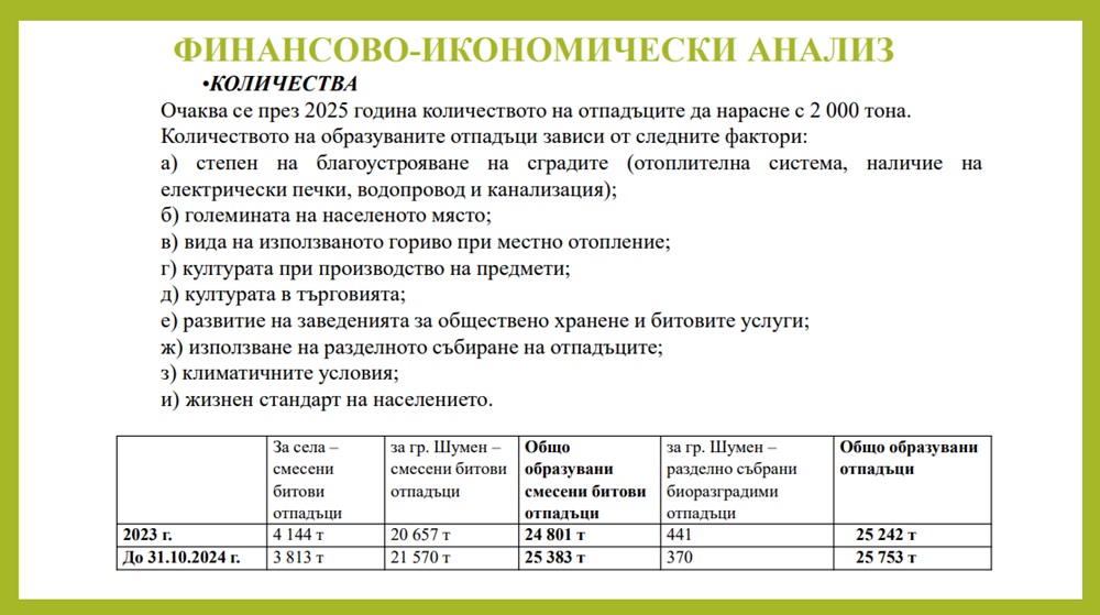 „Очаква се през 2025 година количеството на отпадъците да нарасне с 2 000 тона. Ако общо за 2023 година количеството смесени битови отпадъци и биоразградими отпадъци е било 25 242 тона, то сега – до края на месец октомври, вече надхвърляме това количество – 25 753 тона“, каза Живка Атанасова, главен експерт „Екология“ в Община Шумен.